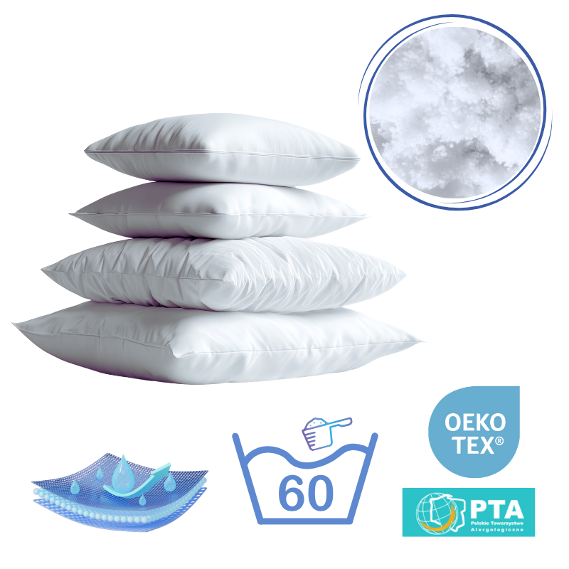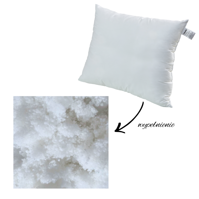 Wypełnienie poduszki to poliestrowe silikonowane włókna dzięki takiemu wypełnieniu tysiącami miękkich i lekkich wysokogatunkowych kuleczek zapewni odpowiednie podparcie głowy i karku. Są one bardzo lekkie i nadają poduszce właściwą sprężystość.