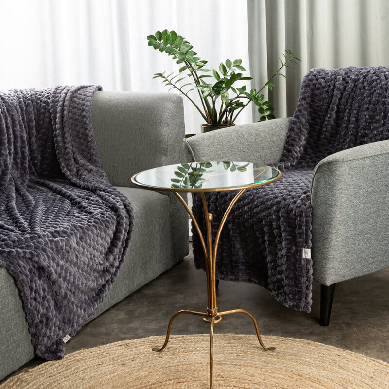 Oryginalna faktura koca oraz subtelny, geometryczny wzór tworzą trójwymiarowy efekt, który przyciąga wzrok i wprowadza do wnętrza nowoczesną elegancję. Wzór ten pięknie komponuje się zarówno z minimalistycznymi, jak i bardziej klasycznymi aranżacjami, nadając im wyjątkowego charakteru. Koc dostępny jest w stonowanych, modnych kolorach, które doskonale harmonizują z aktualnymi trendami wnętrzarskimi i z łatwością dopasują się do Twojego stylu.